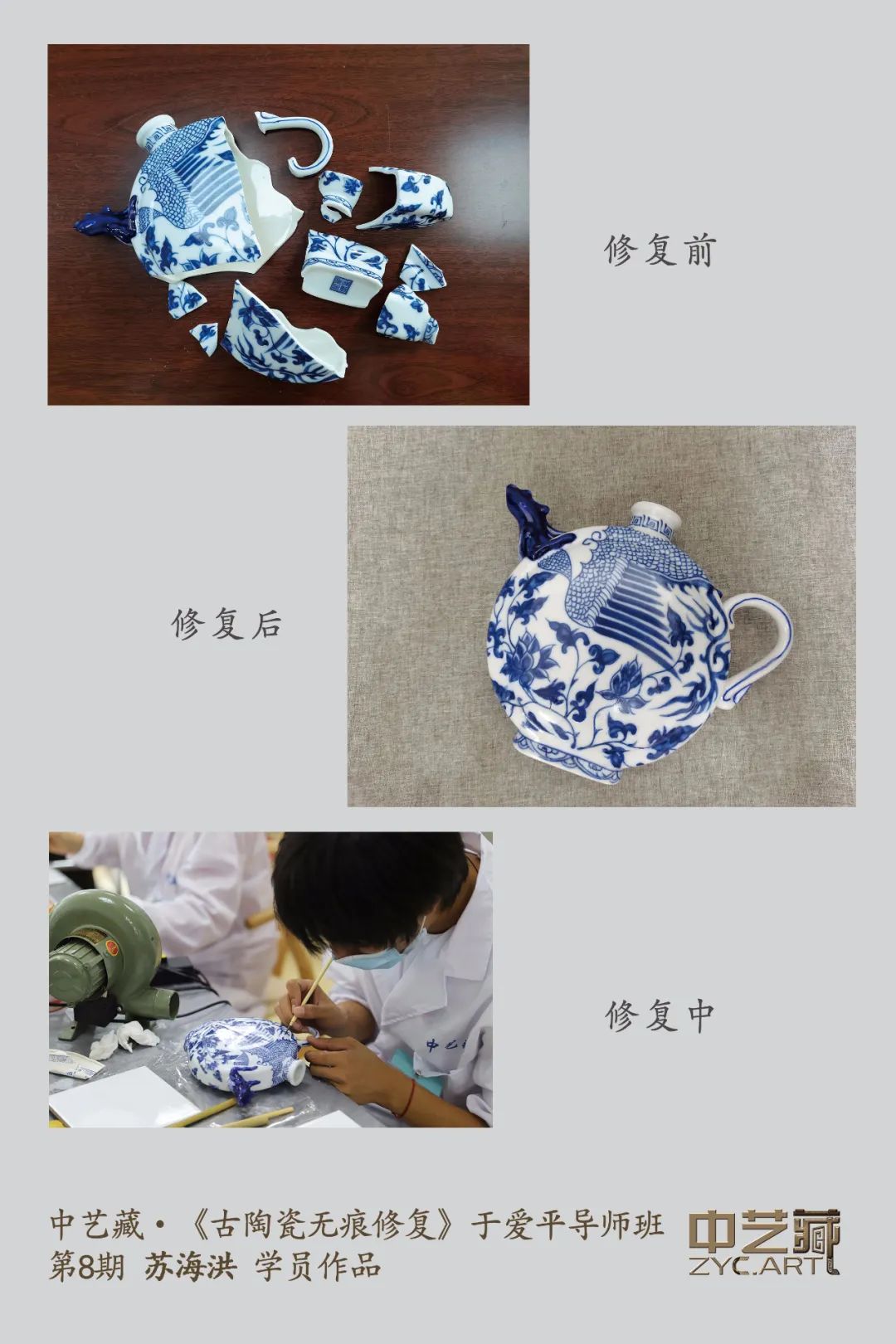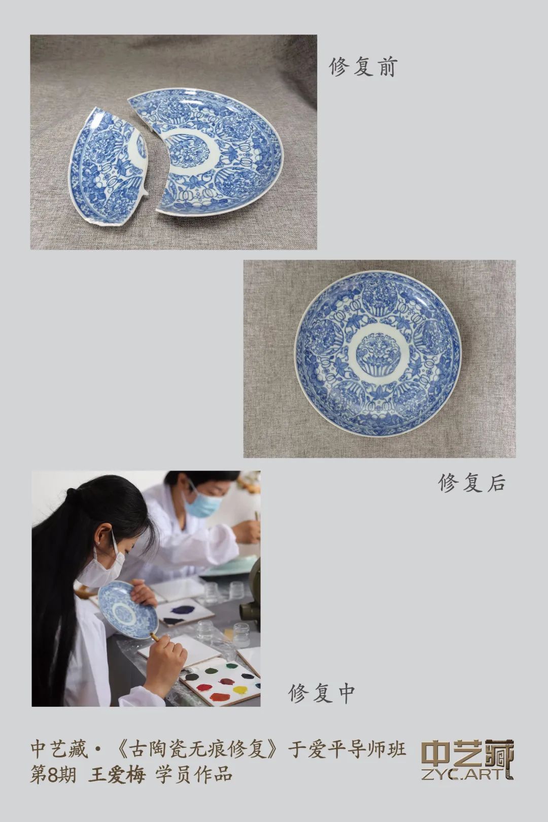 学员一:于老师在课堂上把每一步骤的各种情况,以及所学的材料都做了下细节讲解,很多技术都来自于老师40多年经验积累总结。不过虽然理论过程都熟悉了,但在后来实践修复中,也遇到了一些小问题,好在老师全程都在,出现疑问时老师都会耐心的教我们怎么做,真的是步步有技巧呀。许多方法听起来平平无奇,但实践时却能让人得心应手,差了这些具体的技巧就不能达到理想的修复效果,真是奇妙!在陶瓷修复班上,很多同学都拿来了自己需要修复的藏品,在自己动手修复过程中,于老师就在旁边给予全程帮助和指导。必要时也会亲自上手帮助同学修复,直到满意为止。于老师精湛的修复技术和尽职尽责的高尚师德,都给我们留下了深刻的印象。这次修复课不仅使我们学到了精湛的古陶瓷修复技艺这样的宝贵的非物质文化遗产,还收获了和于老师的师生之缘,和这么多优秀同学的同窗之谊。感谢中艺藏提供这么好的学习平台。我真是收获满满,不虚此行。学员二:我先介绍一下自己在课堂上修复青花瓷的全过程:1.先把瓷器缺口处用牙刷和牙膏反复清洗,对于牙刷实在刷不到的地方,就用电棒反复打磨;2.用509胶把瓷器的缺口大致填补,随后晾干大约需要一个晚上;3.第二天把瓷器用502胶拌上滑石粉把凹凸不平的地方补平,晾干后,用砂纸反复打磨,直到与原来的形状完全一致为止;4.上釉:开启鼓风机,用比较粗的毛笔一边蘸稀释液,一边蘸釉往上刷,同时对着鼓风机吹风,以便于晾干(反复上釉要至少20-30遍,动作要轻,不干不上第二遍);5.调色上色补画:我自己本身美术功底一般,所以补画是于老师给画上去的;6.再次上釉:填色后,青花瓷器正面没有继续上釉,先把反面继续上釉,但我发现越是上釉,越是把原先的釉都给洗掉了,因为该瓷器是比较名贵,害怕再给继续做坏了,就暂时放弃了。瓷器都是在于老师的指导下经我手修复的。于爱平老师是古陶瓷无痕修复纯手工笔涂第一人,用的是笔涂法,笔涂法优势是,修复面积小,色彩还原度高,过度自然,瓷质感强。于老师在课堂上把每一步骤的各种情况,以及所学的材料都做了下细节讲解,很多技术都来自于老师40多年经验积累总结。不过虽然理论过程都熟悉了,但在后来实践修复中,也遇到了一些小问题,好在老师全程都在,出现疑问时老师都会耐心的教我们怎么做,真的是步步有技巧呀。这5天的学习,非常感恩于老师及其丈夫魏老师的指导和帮助,让我从中受益匪浅、收获满满!当然,还要感谢中艺藏,为我们这么多有着共同爱好的同学搭建这么好的学习平台。